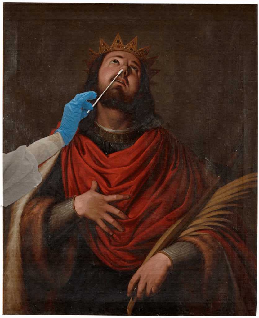 Para la asignatura de taller bidimensional se nos solicitó crear una imagen combinando un cuadro clásico con un elemento moderno. Decidí crear una composición a partir de San Hermenegildo de Antonio María Esquivel, aprovechando su aspecto martirizado para representarlo sometiéndose a una PCR de COVID